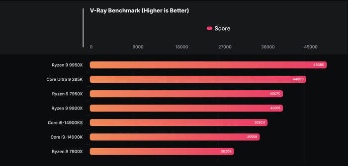 💥 Флагманский процессор Arrow Lake был протестирован в тесте V-Ray — программном обеспечении для 3D-рендеринга. В этом бенчмарке процессор набрал 44 883 балла. Для сравнения, самый быстрый в текущем поколении Core i9-14900KS набирает в этом же тесте 36 924 балла, а Core i9-14900K — всего 35 558 баллов.