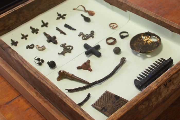 Кроме того, среди находок много предметов, отражающих быт новгородцев: деревянные гвозди, ключи, ложки, ножницы, а также христианские кресты и амулеты. Один из интересных предметов – нож с костяной рукояткой из Западной Европы, на которой, возможно, сохранилось клеймо мастера.