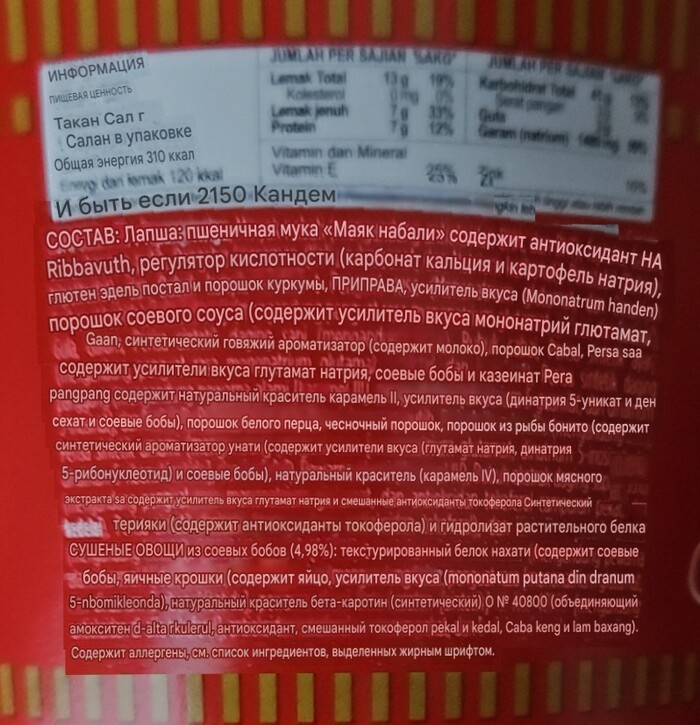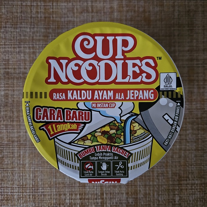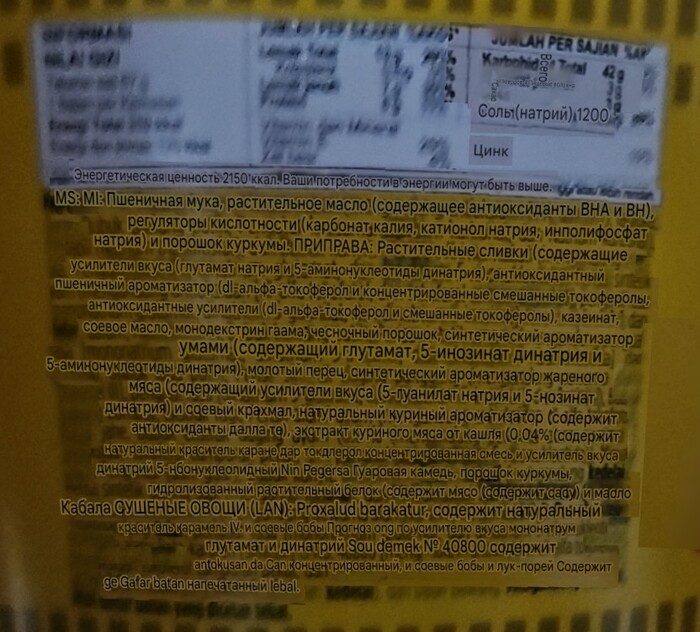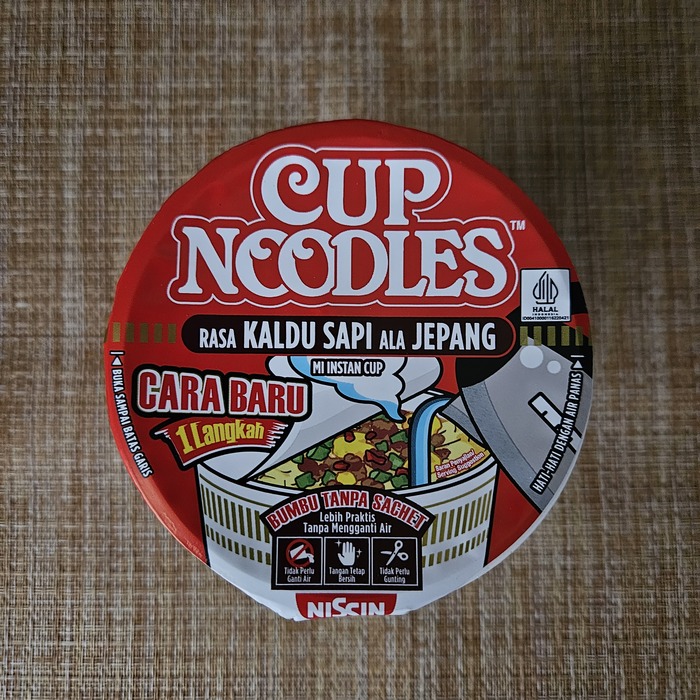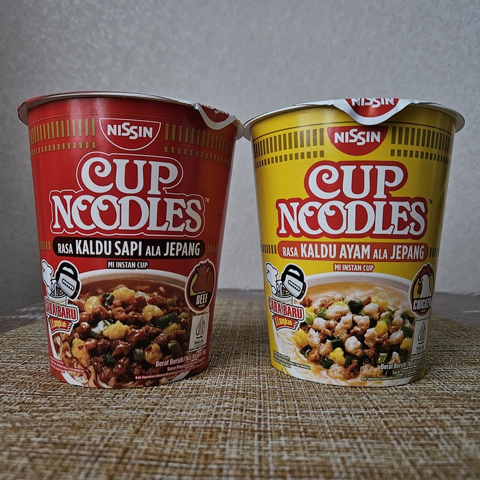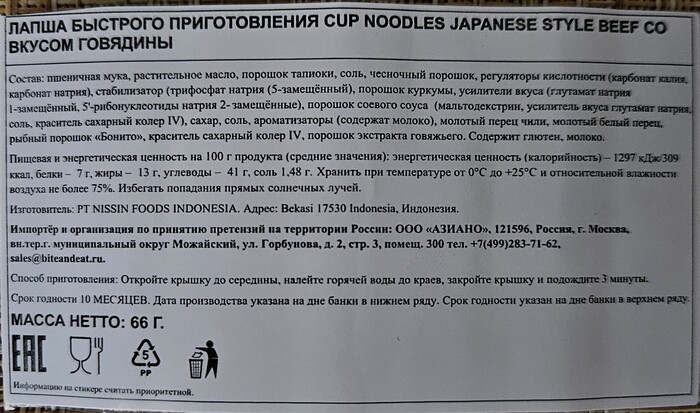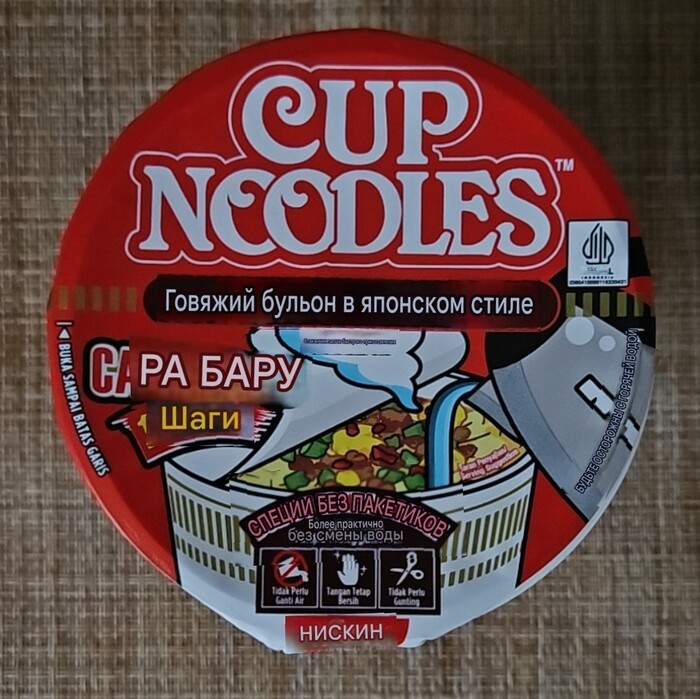 Наши красавцы упакованы в среднего размера пластиковые стаканчики с мягким верхом, обёрнутые в картонный доспех. Оформление яркое, куриная жёлтого цвета, говяжья красного. На стакане имеем информацию на английском, японском и индонезийском языках. Но всё-таки, основная информация, включая инструкцию по приготовлению и состав, на индонезийском. Ну и произведена лапша, как мы уже догадались, в Индонезии. Также имеется и наклейка с текстом на русском языке.