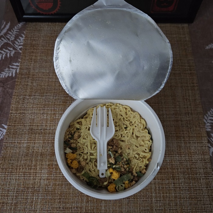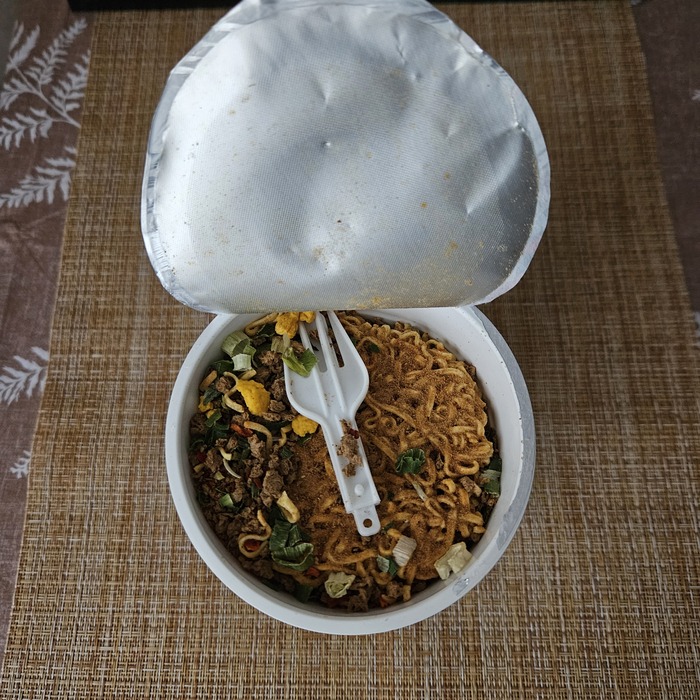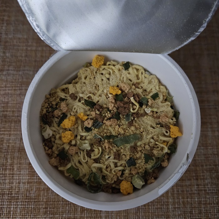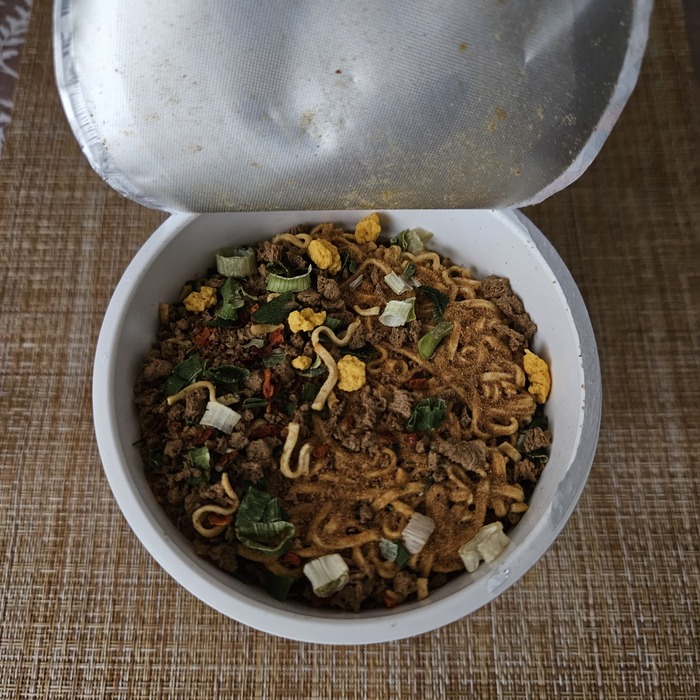 После приготовления получаем аналогичную по размеру порцию, хотя по фото кажется, что бульона чуть больше. К сожалению, того чарующего аромата, который был у куриной лапши здесь нет. Бульон более прозрачный, хоть и темнее по цвету. А самое главное, что нет той насыщенности вкуса, которая была у куриного бульона. Опять же возникает устойчивая ассоциация с говяжьим Роллтоном. В общем съедобно, но не огонь. По остроте также. Примерно 0,2-0,3 островатта. Добавки неплохи, соя так вообще вполне сойдёт за фарш. Лапша тоже вкусна.