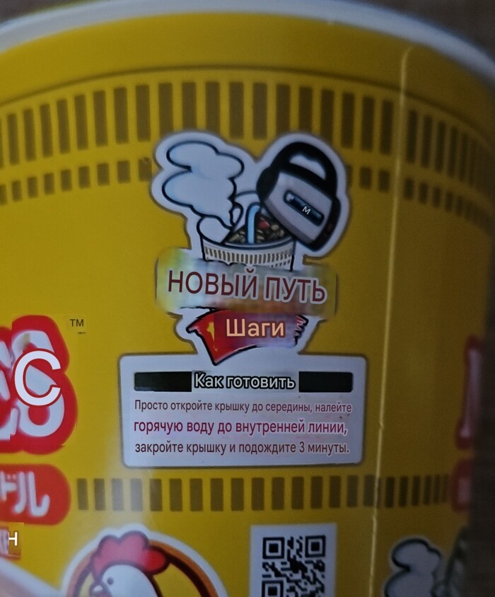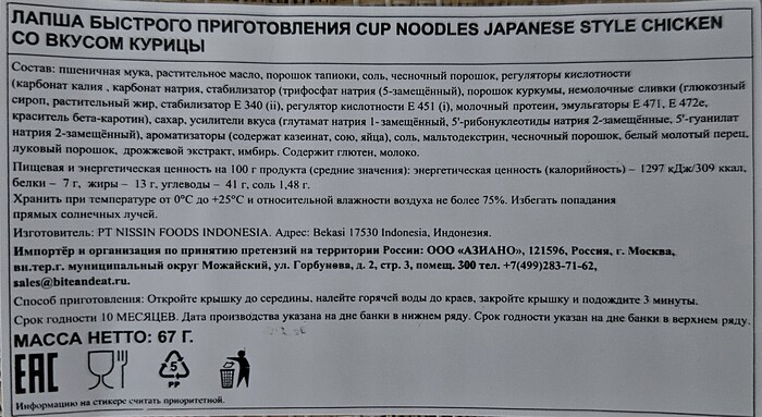 Жребий быть съеденной первой выпал куриной лапше. Поэтому начинаем с неё. Рассмотрим верхнюю крышку и почитаем перевод.