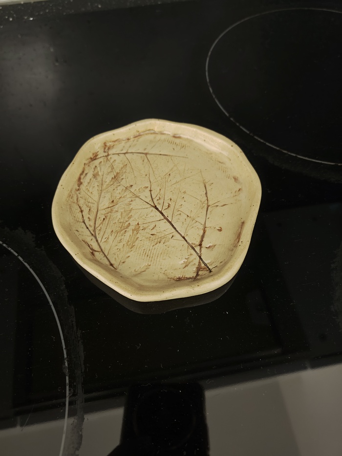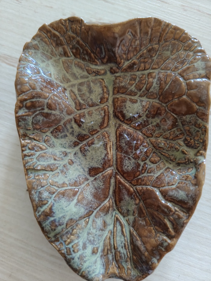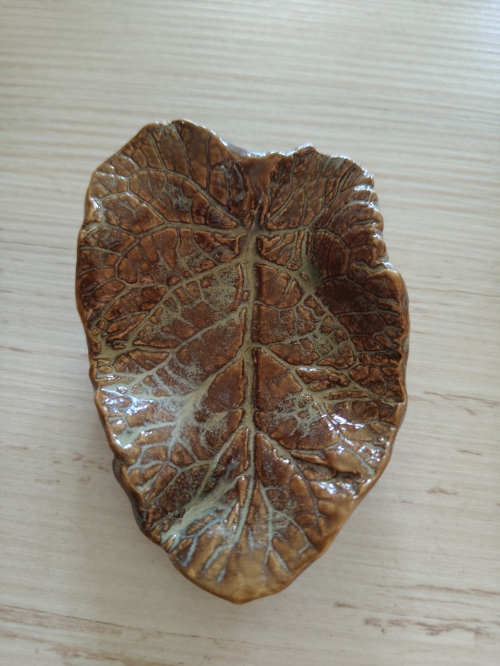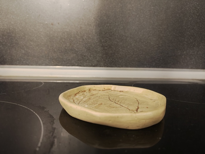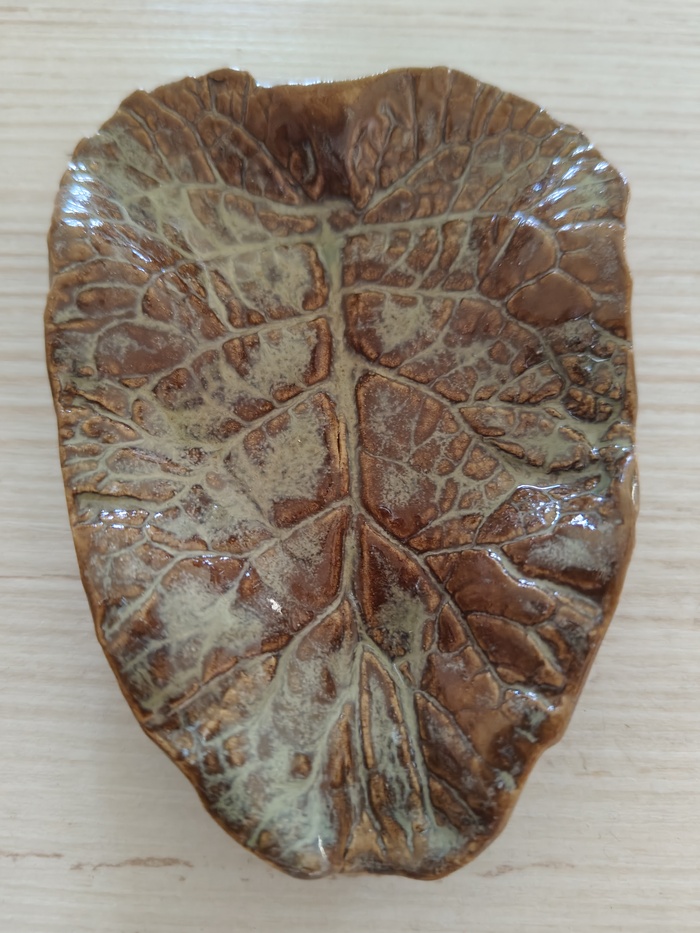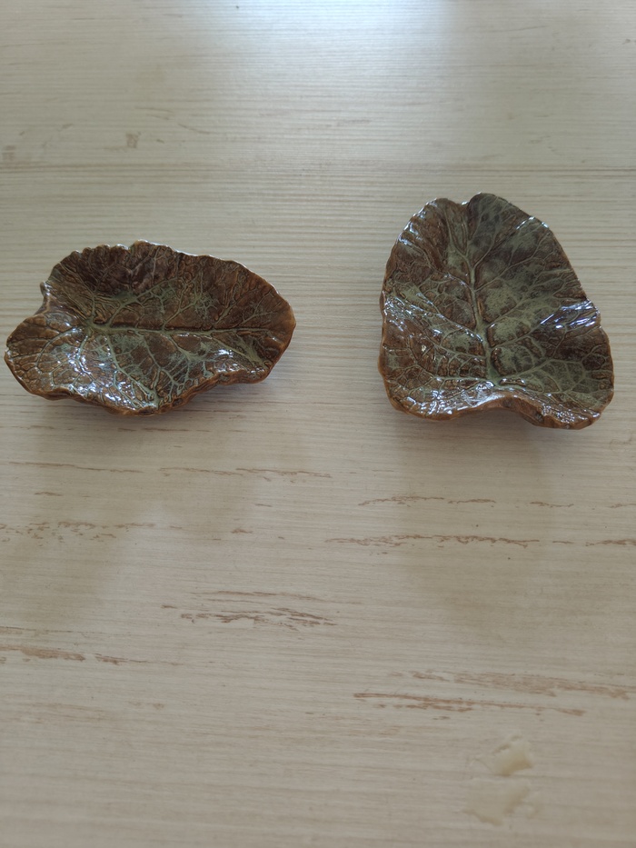 Два микроблюдца размером примерно 8 см в длину и 4 см в ширину. Изготовлены были из пластов, в которых были сделаны оттиски листиков из моего гербария ). По периметру листа пласт обрезала. Далее придала форму, обжиг, затирка пигментом, глазурь, обжиг. Как я уже говорила изделия с оттиском растений выглядят очень эффектно при этом делаются максимально просто и лайтово.