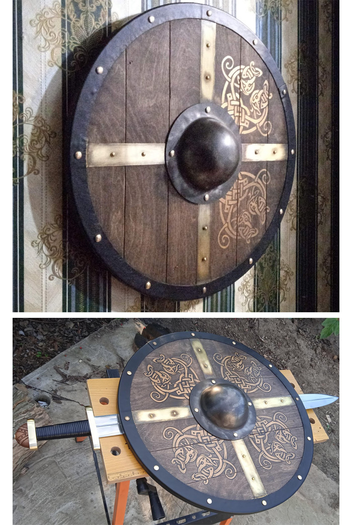 Возвращаемся теперь, собственно, к самому щиту. Для имитации дощечек, из которых обычно собирались такие щиты, проточил несколько вертикальных прорезей по всей площади. Кромку щита обтянул кожей, по окружности вставил 12 больших латунных заклёпок. Затем обработал поверхность древесины тонирующим маслом. После высыхания - нарисовал золотистым акрилом скандинавские узоры. Чтобы они лучше выделялись на фоне потемневшей древесины - обвел их черным. Последний раз перед этим я держал кисть в руках лет 15 назад, уже думал, разучился рисовать... Но всё же что-то получилось, результатом доволен: