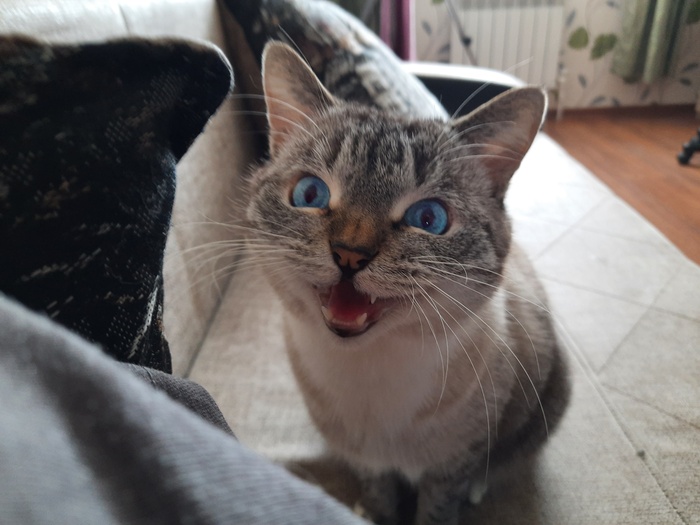Весьма общительное существо. Непрекращающееся мяуканье в течении дня означающее все, от "я соскучился", до "дай мне поесть, мясной мешок"