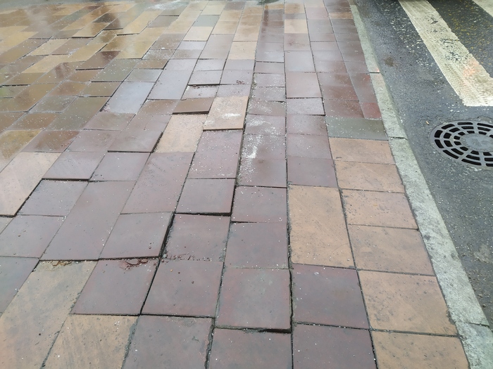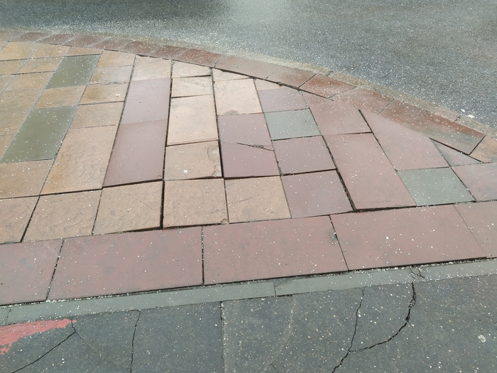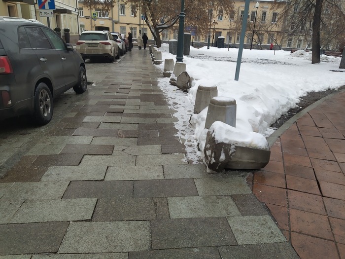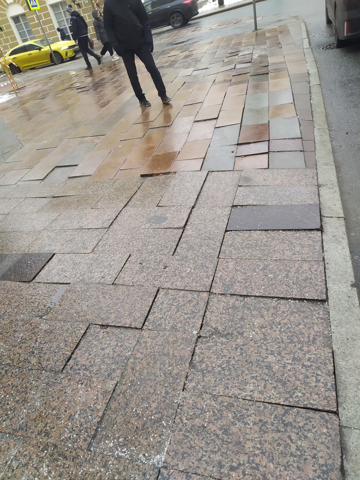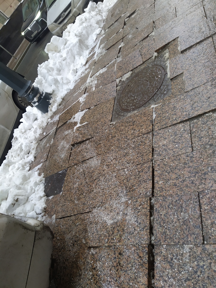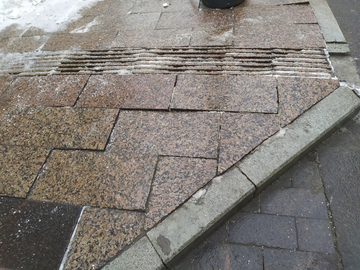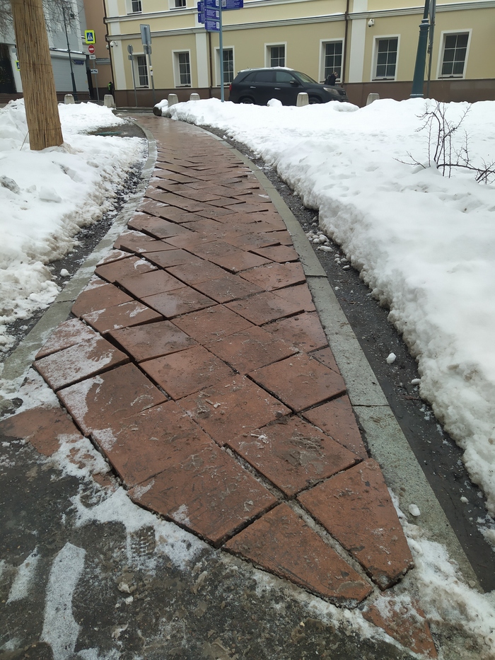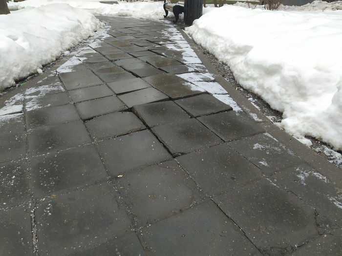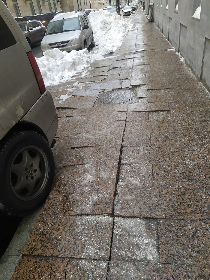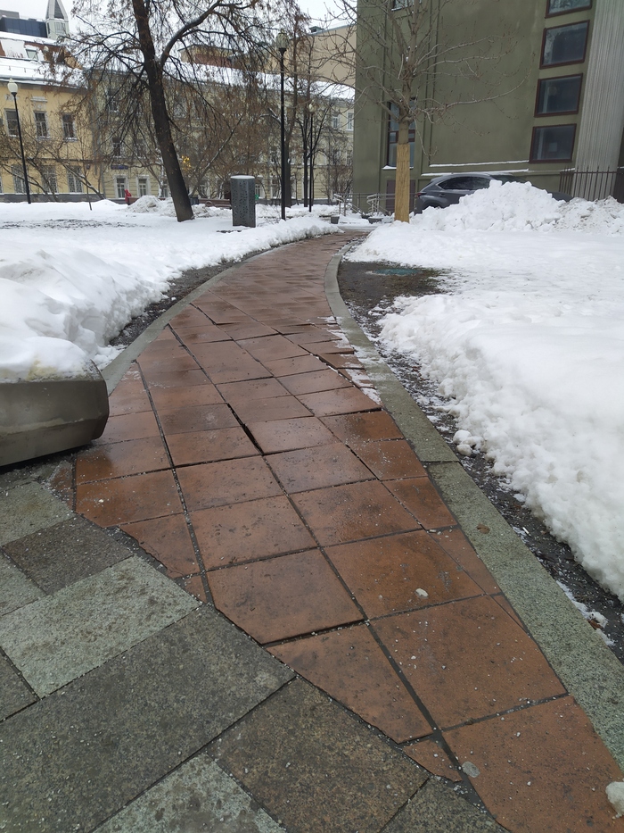 Вот убрали наконец сугробы и явилась взору его плитка, положенная в недавно ушедшем году. Позже её вскопают, раскурочат тротуары, поменяют на летнюю... Потом она тоже затанцует, её вскопают, до зимы будут класть и потом цикл снова повторится. Так и живём: спотыкаемся и машем... ремонтам. Третьего не дано. В чём цимус? Да в том, что это соседний переулок от мерии и не знать об этом всём - надо очень захотеть. И это просто беглый пример по пути от метро до работы. Есть куча мест и похуже...