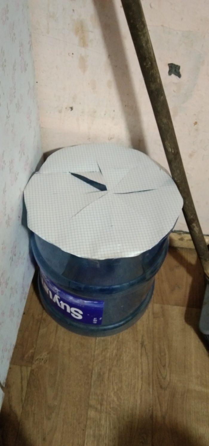 1. Вырезаю ведро из бутыли воды 20-ти литровой, заклеиваю скотчем бумагой сверху и прорезаю в ней "звёздочку".