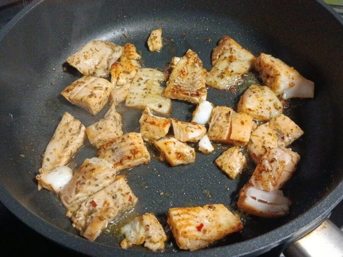 900 гр. полностью обсушенного, нарезанного крупными кусками лойна или филе трески или пикши (1100-1200 гр. замороженной)