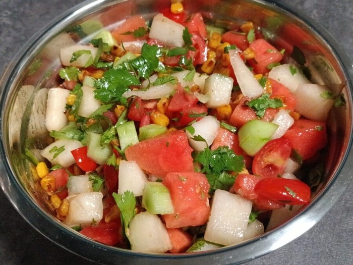 В миске смешать дыню, арбуз, жареные на гриле зерна кукурузы, огурцы, нарезанную кинзу, сок лайма, оливковое масло. Приправить солью.