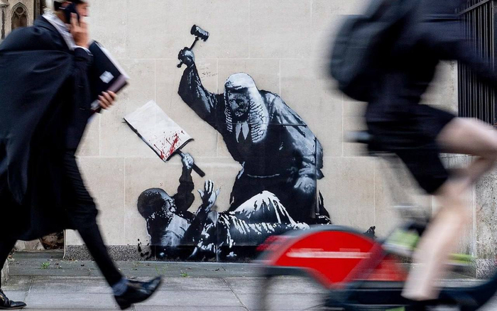 8 сентября новое граффити Бэнкси с изображением судьи, который избивает протестующего своим молотком, появилось в Лондоне.