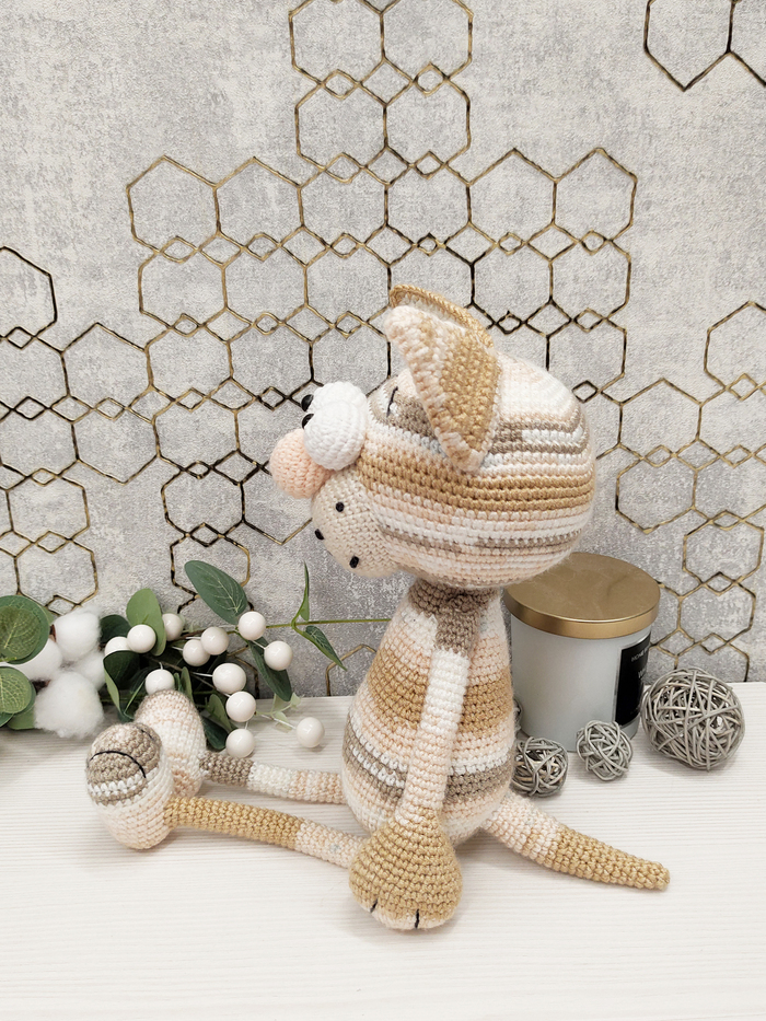 Котенок Снежок. Высота игрушки около 23 см, длина примерно 15 см. Устойчиво стоит. Пряжа 100% полиэстер, наполнитель холлофайбер. Стеклянные глаза (приклеены).