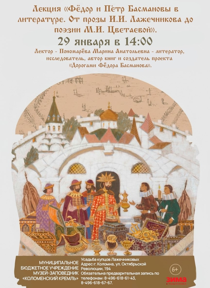 "Дорогие друзья! Приглашаем всех на очередную лекцию Марины Анатольевны Пономарёвой «Фёдор и Пётр Басмановы в литературе. От прозы И.И.Лажечникова до поэзии М.И.Цветаевой». К грозненской эпохи обращались художники, композиторы, литераторы, режиссеры. Писатель и исследователь, автор специального проекта «Дорогами Фёдора Басманова»предлагает поговорить не только о драме И.И. Лажечникова «Опричник», но и вспомнить пьесу А.Н.Толстого «Орел и орлица», стихи поэтов XX века и прикоснуться к яркой, уникальной истории сына Фёдора Петра Басманова – любимого персонажа драматургов XIX века. Лекция состоится в рамках работы выставки «День на государевом дворе», которая 1 февраля завершит свою работу! Ждем всех желающих во флигеле усадьбы!"