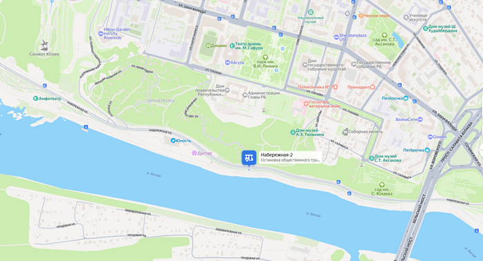 Это, так сказать, прелюдия. Шел дождь, мы были уставшие, и решили вызвать такси до точки, указанной на скрине, раз автобуса нам не дождаться. 2(ДВА) раза водители не хотели спускаться на саму набережную, предлагая нам за 5 минут добраться улицы на вершине холма, чтобы забрать нас оттуда. Сказать, что мы офигели от такого сервиса, это ничего не сказать. Кстати, приехавшее, таки, к нам такси, снова, стоило в пределах 200 руб. И ехали мы минут 15. Вот такая была для нас Уфа с точки зрения местного транспорта.