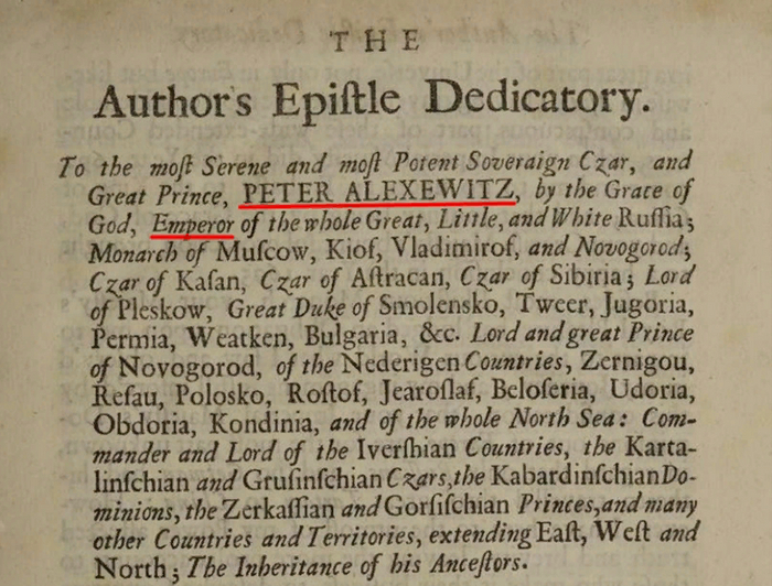 Смешно стало в самом начале. Царь Петр назван Императором (1706г.) (официально, он себя назначил императором в 1721г, Закон №3840 от 22 октября; там же он себя назначил на должность Отец Отечества):