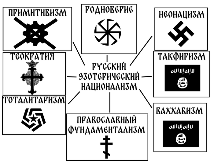 Если кратко, то русский эзотерический национализм является смесью родноверия, православия, ислама (в искажённых формах), иудаизма (имеется в виду "очищенный", "нееврейский" вариант) и индуизма.