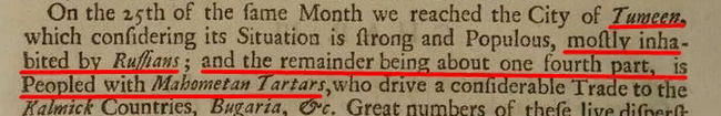 Дальше по тексту про Тюмень и Тобольск прямым текстом написано, что 3\4 населения там Русские, затем частично Магометянские Тартары и Язычники.