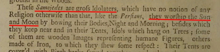 Когда автор поехал в Самоедию, там тоже увидел язычество, люди поклоняются Солнцу и Луне, делают идолов из железа и металла (с.92):