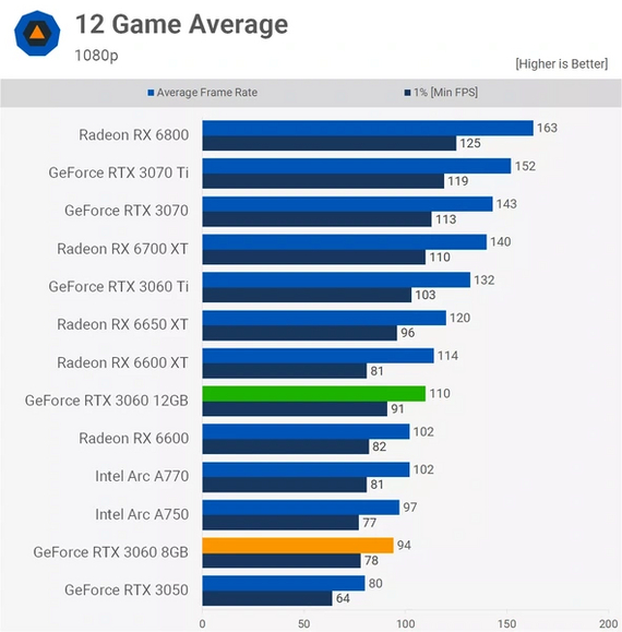 Тестирование проводилось в разрешении 1920×1080, поэтому упора в объем памяти у младшей модели не было. Итак, что мы имеем? Полоса пропускания памяти по сравнению со старшим вариантом снизилась на 33 %, а средняя производительность — на 15 %. Следуя логике, можно сказать, что ПСП у старшей карты с небольшим запасом, а вот младшей ее недостает.