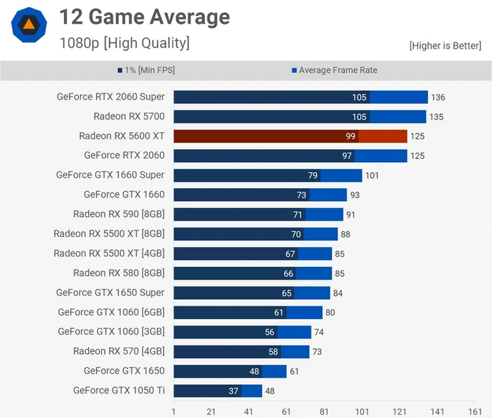 Старшая модель обладает на 33 % большей ПСП, но разница в производительности куда скромнее — на уровне 8 %. И это несмотря на то, что частота ГП у RX5600 XT хоть немного, но меньше. Еще один пример случая, когда огромная ПСП не нужна графическому процессору такого уровня.