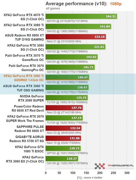 У старшей модели ПСП на 36 % больше, но разница в производительности на уровне погрешности. В редких проектах память GDDR6X дает такому ГП прирост чуть более 5 %, в остальных не наберется и такой разницы.