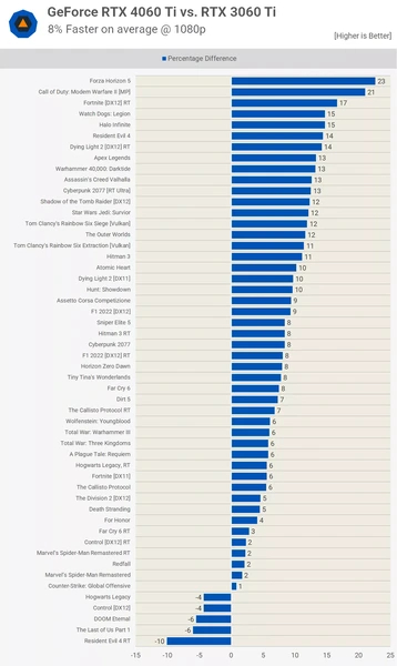 А вот модели нового поколения GeForce RTX4060 Ti ПСП недостает. По вычислительной мощности карта быстрее RTX3060 Ti на треть, но по реальной скорости обходит предшественницу на 8 %. Виной этому — 128-битная шина памяти GDDR6 со скромной ПСП 288 ГБ/c, что на 36 % меньше, чем у прошлой модели. Хотя и при такой полосе пропускания карта умудряется быть быстрее RTX3060 Ti в среднем, немного отставая лишь в некоторых проектах.