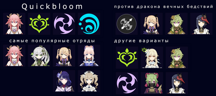 5. Следующий по популярности вариант - солянка из квик/хайперблумов, где вместо второго электро персонажа взят анемо персонаж - либо для стяжки (Казуха/Венти/Сахароза), либо для замены гидро хила на гидро дпс (Джин + Син Цю/Е Лань).