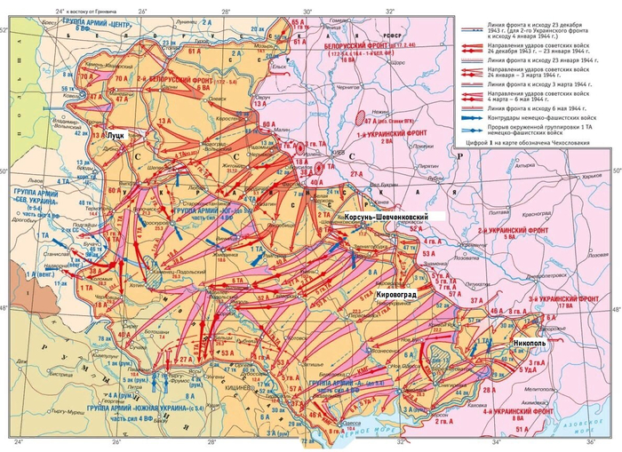 А 24 января 1944 года ударом с севера и юга частей 1-го и 2-го Украинских фронтов начинается наступление, которое приводит к окружению немцев. При этом немецкие войска у Кировограда в этот момент оказываются не у дел. А дальше у немцев срабатывает сталинградская травма, все обещают спасти окруженцев, коих было 60 тысяч, ведь на кону доверие к Гитлеру, поэтому все силы кидают на деблокирование своей группировки на берегу Днепра. А наше командование идет еще на более хитрый ход, начав еще две операции. В ходе первой наши кавалеристы без поддержки с воздуха наступают и освобождают Ровно и Луцк на северном фасе, образуя разрыв между группой армий "Центр" и "Юг", а на южном начинается успешное наступление под Никополем.