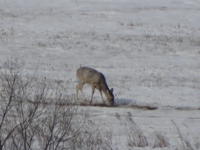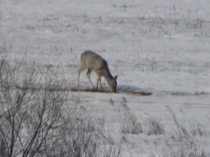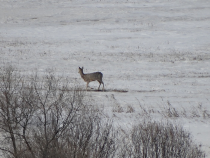 Наш первый объект наблюдения это косуля. Они вытягиваются в стрелу и перепрыгивают пограничные столбы с колючкой, переплывают осенью протоку и выходят на поля, питаются остатками с полей. Зимой, когда нет растительности их легче замечать. Косуль достаточно много, зимой забавно наблюдать, как они копытцами подбивают землю в надежде найти еду...