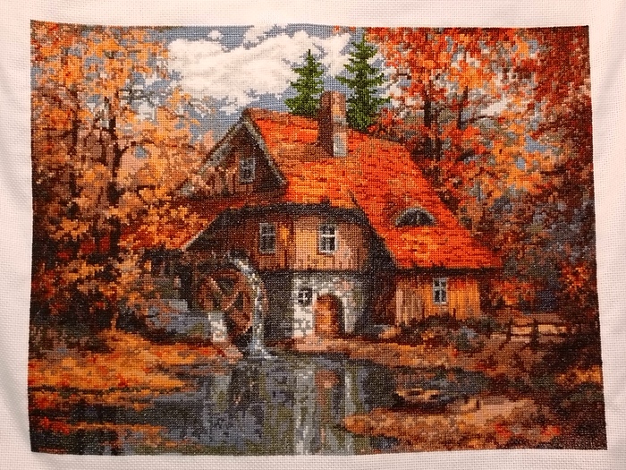 Вышивала по набору "Водяная мельница" (производитель "Палитра", арт. 08.003), в общей сложности получилось более 48тыс. крестиков. Размер 39х30см. В работе использовалась белая канва Aida №16 "Bestex" и 28 цветов мулине "ПНК им.Кирова" (без блендов). Всё выполнено в технике счётный крест, сплошная зашивка.