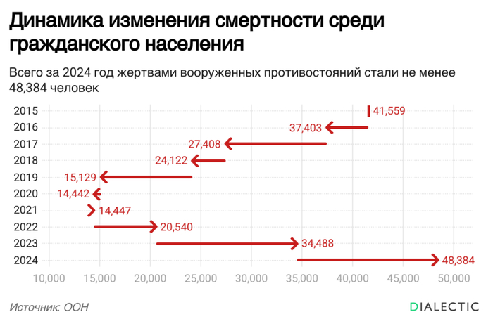 Всего в прошлом году жертвами вооруженных конфликтов стали не менее 48 тысяч человек, что означает, что в среднем одна смерть фиксировалась каждые 12 минут. Аналитики ООН отмечают, что это уже третий год подряд, когда мир сталкивается с резким скачком смертности: в 2022 году рост составил 53%, а в 2023 году этот показатель увеличился на 72%.