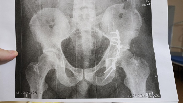 Итак, попал в ДТП сидя на пассажирском сиденье 24.12.2023 года. После катания по деревням и прочим притрассовым больницам наконец то на следующий день попал в родной город, где было сделано кт и поставлен диагноз нестабильной перелом вертлужной впадины с смещением по длиннее и ширине. В этот же день был установлен аппарат внешней фиксации, который был собран из говна и веток( собирали из остатков аппарата иллизарова и кривых болтов). Далее со всей этой приблудой поехал за 1500 км на поезде в более нормальную больницу в другой город 1.01.2024 года. Так как в нашем городе таких операций не делают. После приезда в другую больницу после праздников 9.01.24 сняли аппарат фиксации (на живую, без анастезии) и положили на вытяжку на 9 дней. После чего наконец таки 18.01.24 сделали операцию по установки пластины на сломанную впадину. Первые дни после операции были вообще какие то жуткие боли и на 4 день пришёл врачь и сказал что надо пробовать вставать. После нескольких попыток я наконец то встал, но чуть не потеряв сознание быстрым темпом в режиме полёта лёг обратно. Выписали меня с больницы 26.01.24 так и не научились ходить на костылях. Опять поезд и домой. Сегодня 6.02.24 научился ходить на костылях, вроде даже не плохо, но через раз происходит такая ситуация что при ходьбе при движении больной ноги в суставе происходит дикая боль. Причём это какая то незакономерная ситуация, может болеть а может и не болеть, сегодня лежа в кровати сустав болел просто капец, любое движение ногой сопровождалось болью. Пью витамины, таблетки от нервопотии( так как намяли немного седалищный нерв) и пользуюсь аппаратом алмаг +. Сидеть не могу, очень больно ягодицу, где была операция. Немного мокрит шов и так же остаётся большой отек на ягодице.На ноге, отек убрали, то ли массажем, то ли ещё чем, так и не понял. Надеюсь что эти боли начнут в скором времени проходить. Буду по мере выздоровления дополнять, рассказывать как идёт заживление, в интернете очень мало информации про такие травмы и как реабелитироваться, так что если у кого то есть опыт, буду очень рад если вы со мной поделитесь.