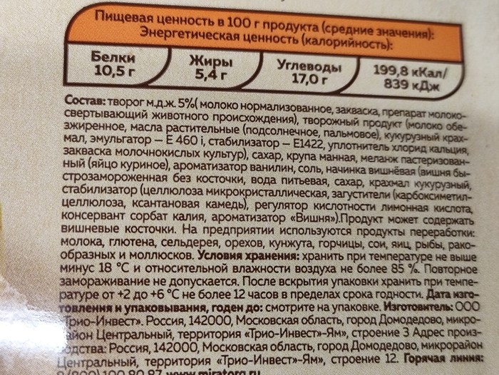 Вердикт нейросети: Уже не классика. Основа — не творог, а «творожный продукт» с пальмовым маслом и целым набором стабилизаторов для создания нужной текстуры. Формально безопасно, но это уже имитация натурального продукта.
