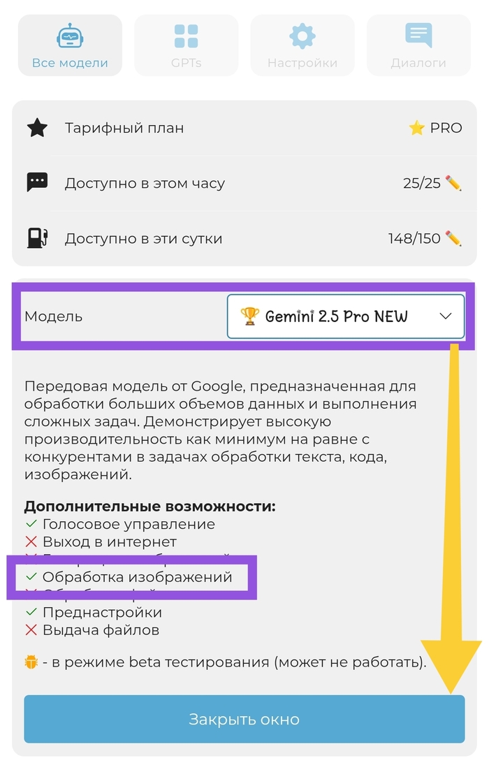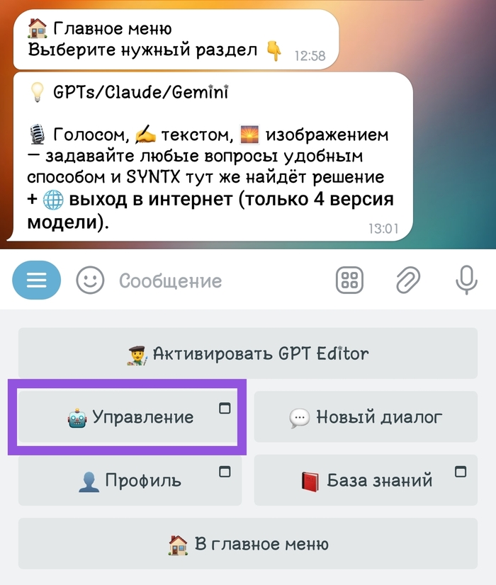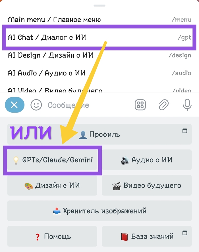 3️⃣ 🧠 Выбери нейросеть с поддержкой фото через меню: Диалог с ИИ ➡️ Управление.