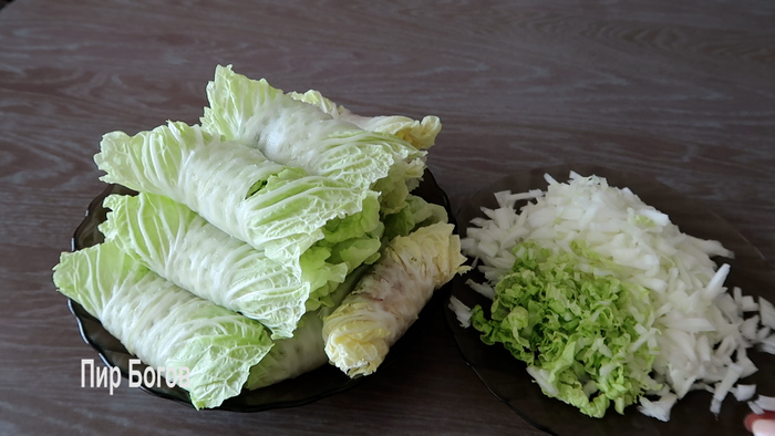 Вроде всё есть, не хватает только шампиньонов, но уж чего нет - того нет... Во-первых, кромсаем и отвариваем капусту.