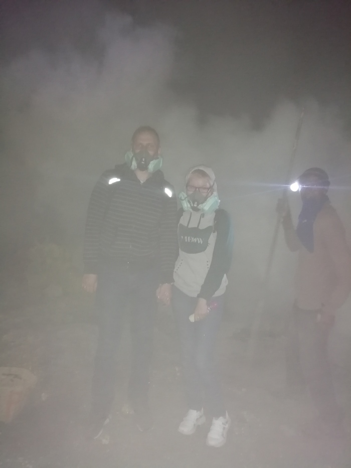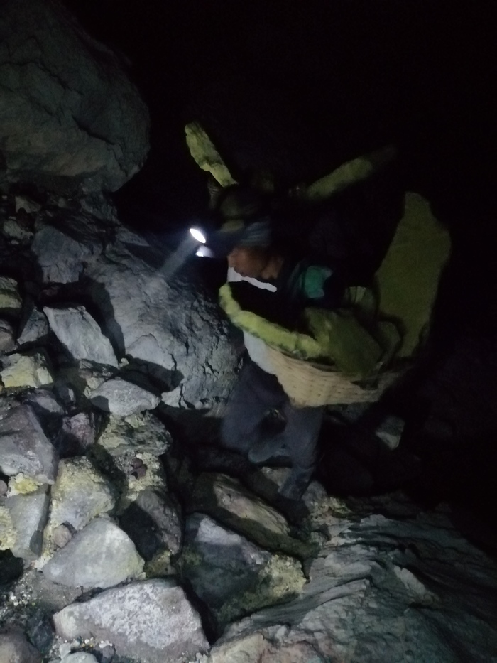 За пару часов добрались до вершины. Потом началось самое сложное - спуск внутрь кратера. Он очень крутой, фактически по самодельным ступенькам. Периодически попадались шатающиеся валуны, в полной темноте, только свет от фонарика, за стены браться нельзя (можно получить химических ожог). Отягощалось все дыханием через респиратор. По дороге вниз нам навстречу поднимались носильщики серы (в 4 утра, Карл! Поднимаются!).