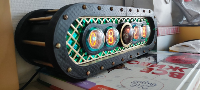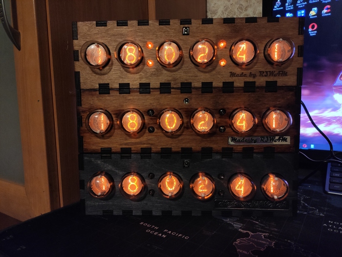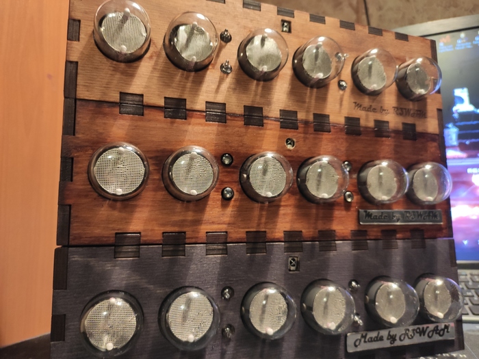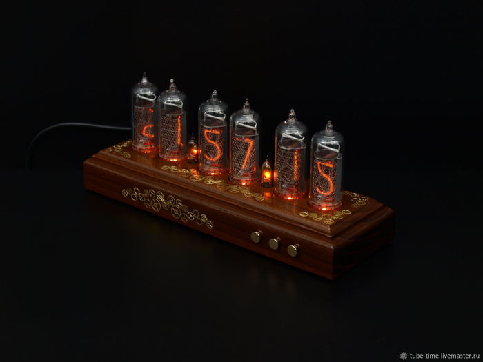 Лампы часов выполнены в виде старых газоразрядных ламп, но из оргстекла, подсвеченного сверхъяркими светодиодами.