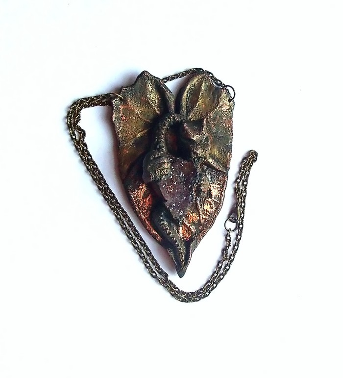 Куриный череп развалился при подвеске, да и окрасил я его совсем неровно. Так что меднить до упора не стал. Но медь нормально ложится, видно.