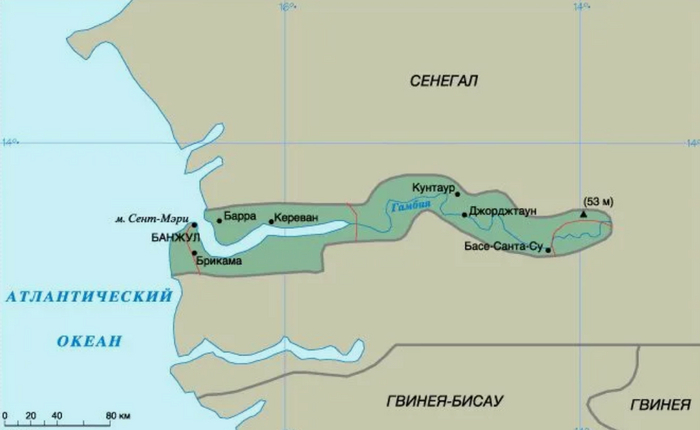 Гамбия – это так называемая страна-полуанклав. Она со всех сторон окружена Сенегалом. Общая длина госграницы с единственным соседом составляет около 740 км.