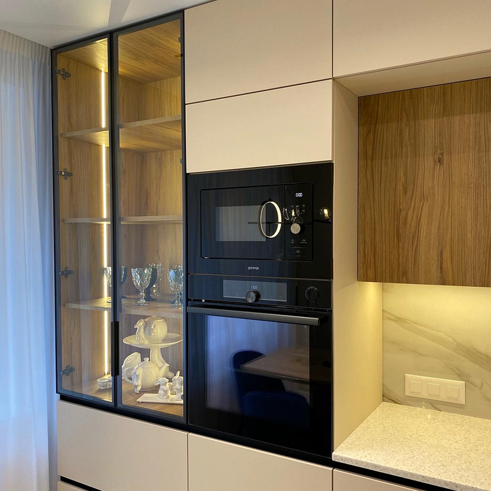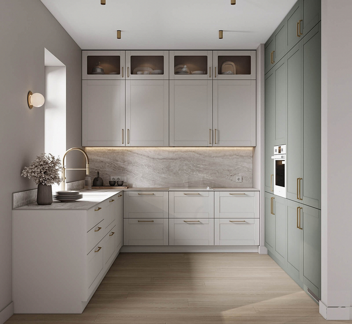 Если есть возможность — выделите мини-хранение вне кухни: кладовку, шкаф в коридоре, стеллаж в прихожей. Туда можно убрать сезонную технику, запасы и всё то, чем вы не пользуетесь каждый день.