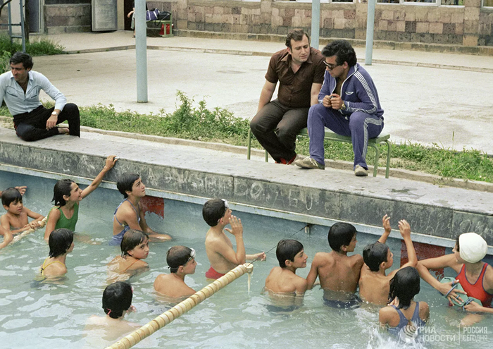 Тринадцатикратный чемпион Европы, семикратный чемпион СССР по подводному плаванию, директор строительства водно-спортивного общества Шаварш Владимирович Карапетян, спасший из свалившегося в результате аварии в Ереванское озеро троллейбуса 20 человек (в центре). Слева — инструктор-методист по плаванию Камо Карапетян, справа — тренер детской спортивной школы при Ереванском институте физкультуры Анатолий Карапетян
