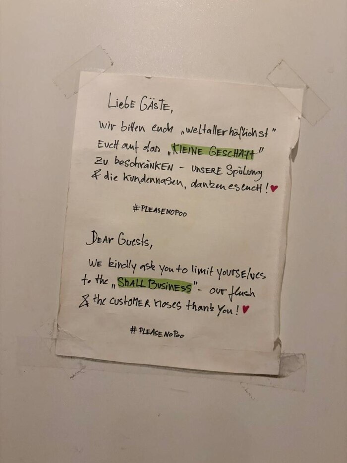 Ну всё, друзья, цивилизация официально упала ниже канализационной трубы. Немецкие и итальянские кафе ввели «экстренные меры»: таблички в туалетах просят ограничиться только мелкими делами. Простите, но если вы зашли «с серьёзными намерениями», вам придётся либо уйти, либо смириться с этим космическим запретом.