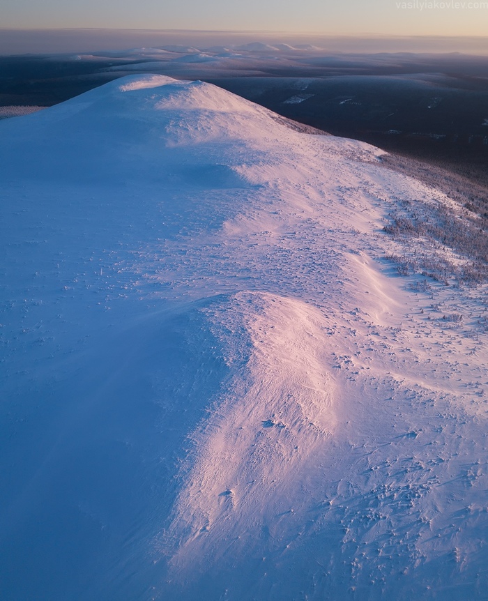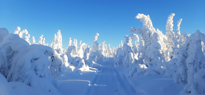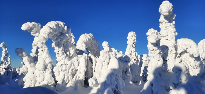 Дует сильный ветер, вьётся позёмка. Глубина снега 2-3 метра. На снимке только верхние части елей и редких берёз. Ветер, встречая препятствие в виде дерева, камня, меняет направление и выдувает перед препятствием углубление. Глубина этого углубления составляет более двух метров.