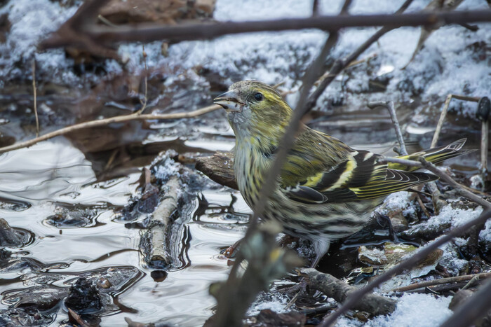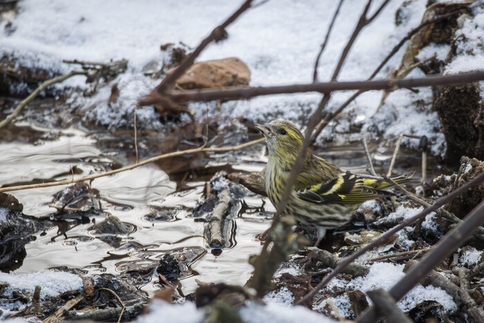 Хоть в Москве и ударили морозы, но к проточному ручью все равно слетаются птички. В данном случае две самочки Чижа спустились с деревьев, чтобы попить