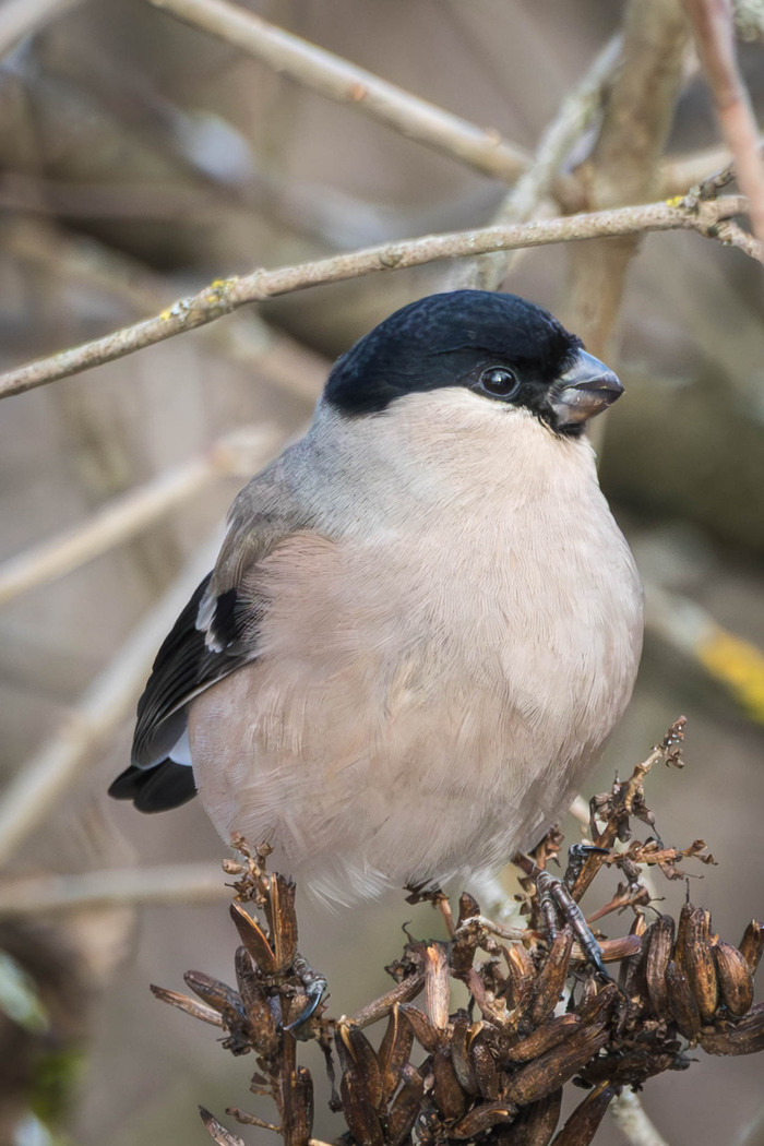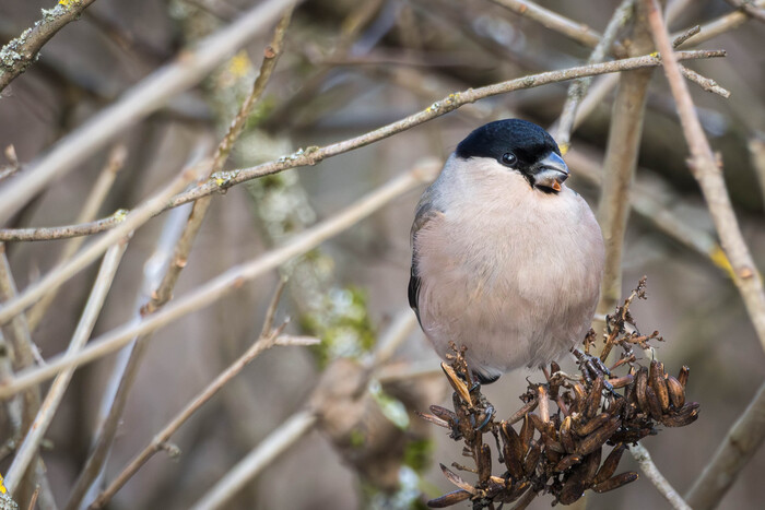 Снегири все еще довольно редко спускаются с вершин деревьев, но некоторых можно выцепить в кустах.