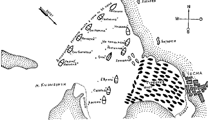Главный же удар по турецкому флоту был назначен на ночь. Согласно плану, четырём линейным кораблям, двум фрегатам и ещё четырём брандерам во главе с линейным кораблем четвертого ранга «Европой» необходимо было войти в Чесменскую бухту и немедленно атаковать турецкий флот. В то время как более крупные корабли должны были обстреливать турецкие суда, группе брандеров необходимо было подойти вплотную к противнику и поджечь как можно больше кораблей.