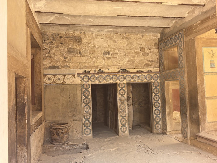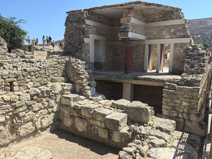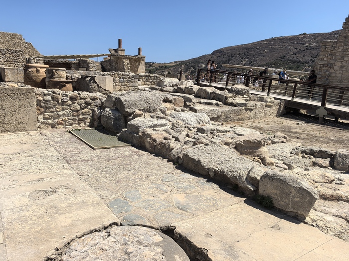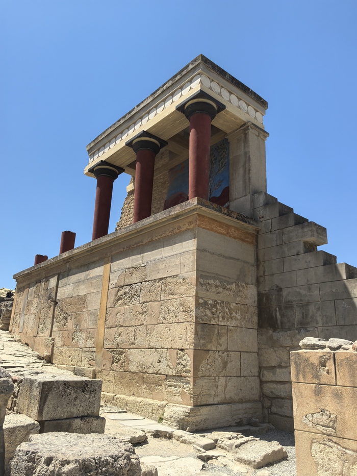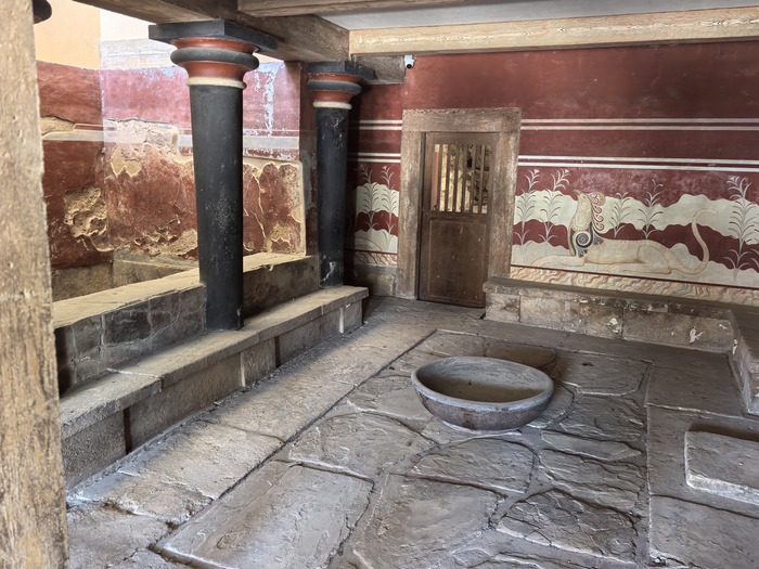Холл двух топоров и Мегарон Королевы — это известная комната-апартаменты, известная своей роскошной отделкой, особенно знаменитой фреской с дельфинами, и включает ванную комнату и световой колодец