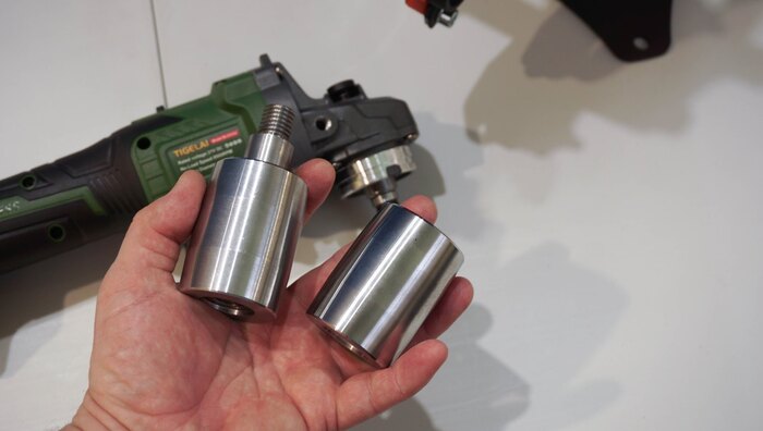 Мне была интересна идея превратить данный станок в многофункциональное приспособление, путем установки различных модулей. В частности, установка шлифовального модуля потребует замены приводного ролика на «болгарке» со штатного на доработанный. Доработка заключается в наличие вала М14 под опорную тарелку.