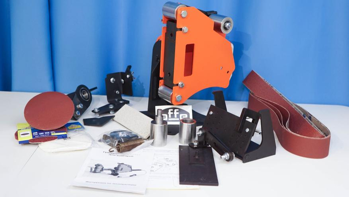 Давно хотел себе в мастерскую ленточный станок для шлифовки и сведения заготовок и остановил свой выбор на универсальной модели Affe 915: это вариант, который не просто легко использовать, но и вполне можно настроить для своих целей: существуют модули для шлифовки и полировки, приспособления для заточки сверл, дополнительные апгрейды (типа керамической пластины под ленту). В комплекте есть держатель для ножевой заготовки, а также есть возможность переворота гриндера под нужным углом.