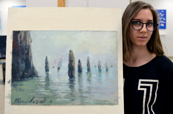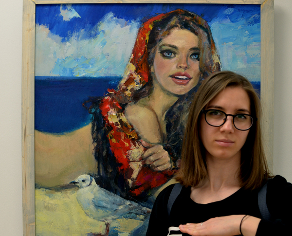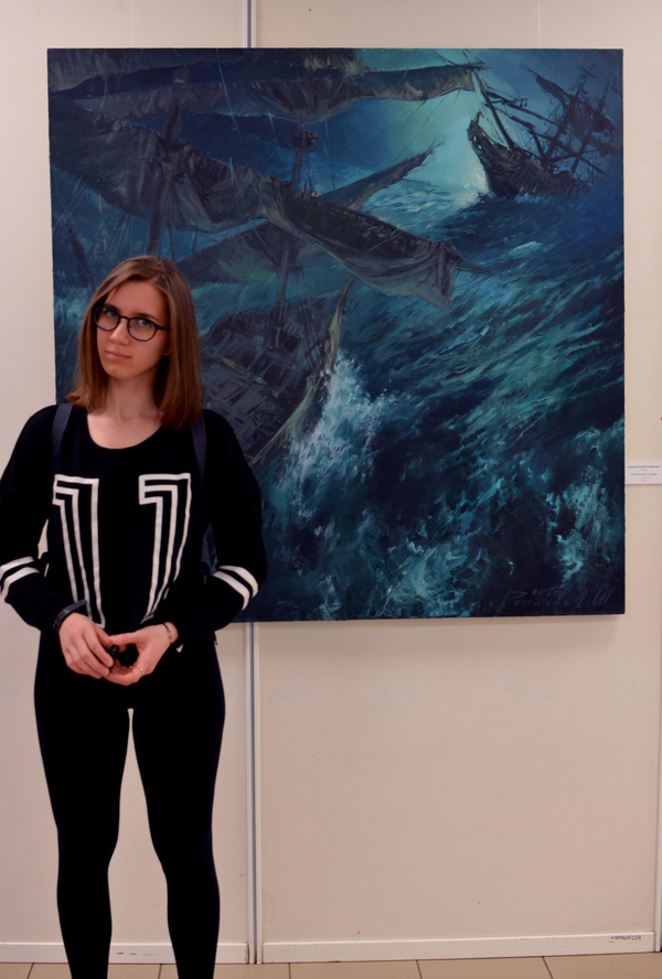 Возле свой же работы , странно , заметила одну вещь пока прогуливалась по голерею , люди заходившие в музей видя мои работы , в первую очередь походили к ним и были удивлены , после чего смотрели Айвазовского. То ли радоваться то ли нет .