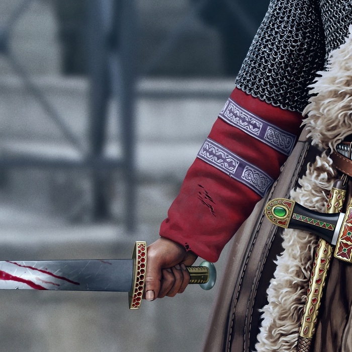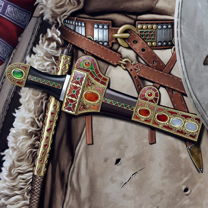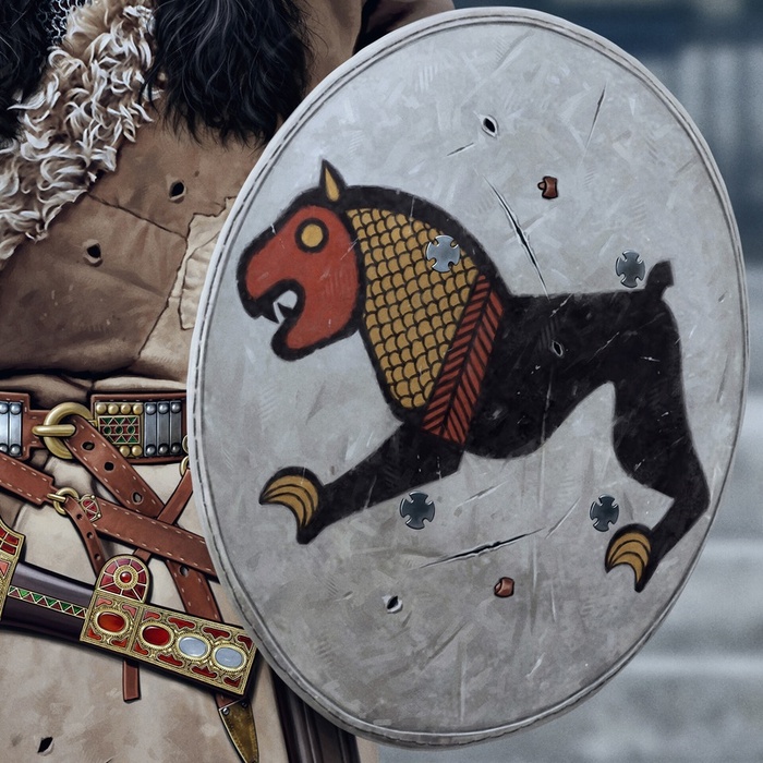 В основу меча легла гуннская находка из Абрау-Дюрсо (Кавказ). Воин также носит позднеримскую «коптскую» тунику, штаны, украшенные китайским шелком V века, и кожаный тулуп, вдохновленный находками V века из Монголии и римскими описаниями гуннов, носивших шкуры животных. Корпус лука и колчан объединены в «горитос», архаизм скифского происхождения, который еще использовался в гуннский период. Кольчужная рубашка создана по мотивам находки из Самары, Россия.