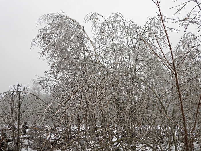 Все ветки и иголки покрываются толстой ледяной коркой. Под ее тяжестью кусты и деревья склоняются чуть ли не до земли. Многие из них ломаются. А уж сколько неприятностей такая погода приносит водителям…